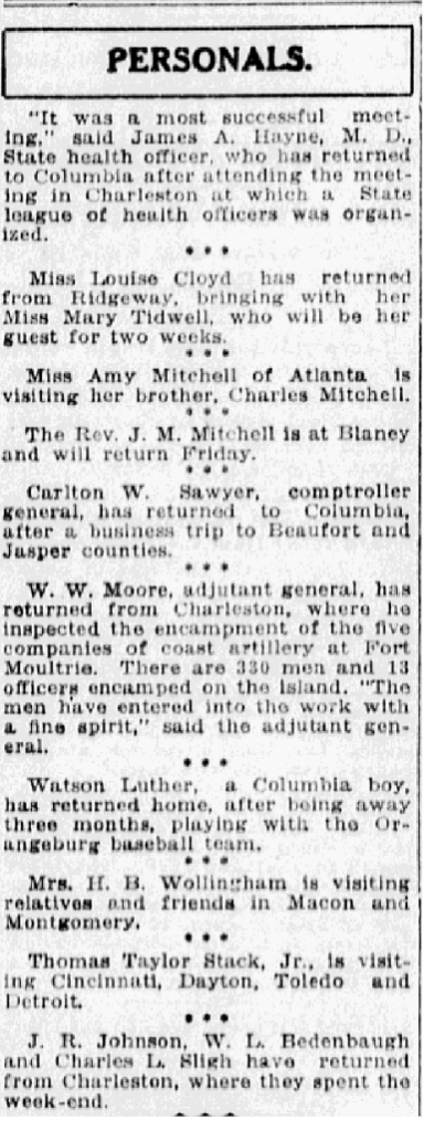 Watson Luther, a Columbia boy, has returned home, after being away three months, playing with the Orangeburg baseball team.