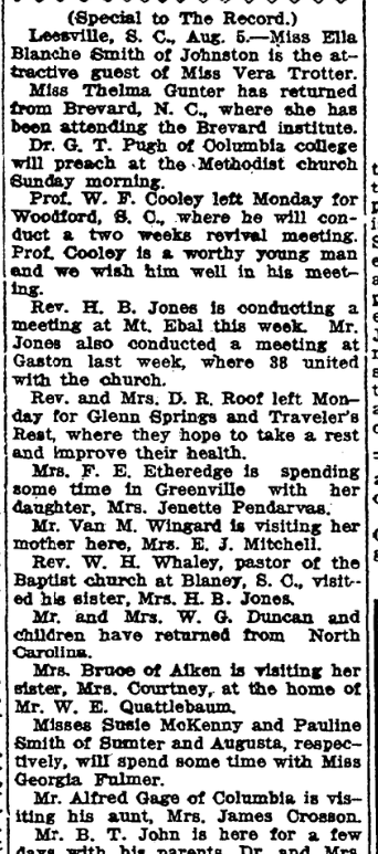 (Special to The Record.) Leesville, S. C., Aug. 5. – Miss Ella Blanche Smith of Johnston is the attractive guest of Miss Vera Trotter. Miss Thelma Gunter has returned from Brevvard, N. C., where she has been attending the Brevard institute. Dr. G. T. Pugh of Columbia college will preach at the Methodist church Sunday Morning. Prof. W. F. Cooley left Monday for Woodford, S. … Continue reading Leesville