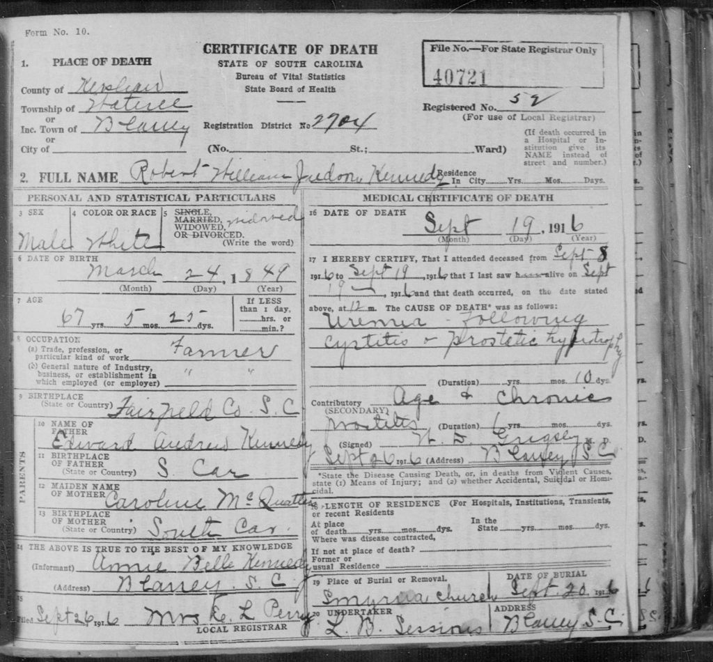 Robert William Judson Kennedy died on 19 Sep 1916 in Elgin, Kershaw, South Carolina, USA and was buried on 20 Sep 1916 in Elgin, Kershaw, South Carolina, USA at Smyrna United Methodist Church Cemetery. His cause of death was uremia following cystic due to prostatic hypertrophy.