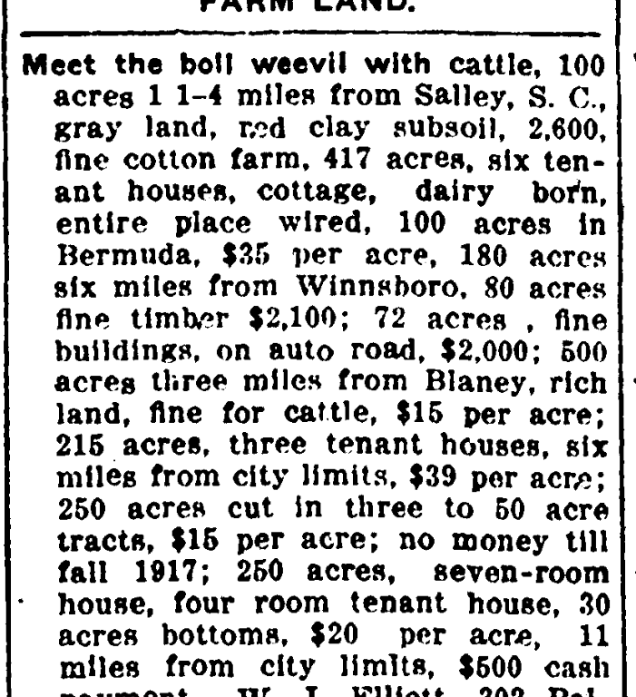 Meet the boil weevil with cattle, 100 acres 1 1-4 miles from Salley, South Carolina, gray land, red clay subsoil, 2,600, fine cotton farm, 417 acres, six tenant houses, cottage, dairy barn, entire place wired, 100 acres in Bermuda, $35 per acre, 180 acres six miles from Winnsboro, 80 acres fine timber $2,100; 72 acres, fine buildings, on auto road, $2,000; 500 acres, three miles from Blaney, rich land, fine cattle Farm, $15 per acre; 215 acres, three tenant houses, six miles from city limits, $39 per acre; 250 acres cut in three to 50 acre; 250 acres cut in three to 50 acre tracts, $15 per acre; no money till fall 1917; 250 acres, seven-room houses, four room tenant house, 30 acres bottoms, $20 per acre, 11 miles from city limits, $500 cash payment, W. J. Elliott, 302 Palmetto Bldg.