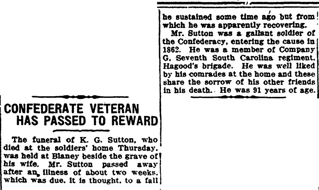 Mr. Sutton was a gallant soldier of the confederacy, entering the cause in 1862. He was a member of Company G. Seventh South Carolina regiment, Hagood’s brigade. He was well liked by his comrades at the home and these share the sorrow of his other friends in his death. He was 91 years of age.