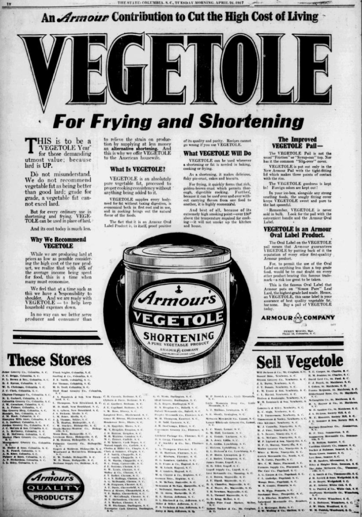 The Oval Label on the VEGETOLE pail means that Armour guarantees VEGETOLE by putting back of it the reputation of every other first-quality Armour product.