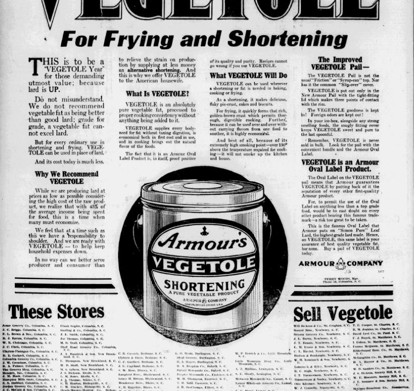 This is the famous Oval Label that Armour puts on “Simon Pure” Leaf Lard, the highest grade lard made. hence, on VEGETOLE, this same label is your assurance of best quality vegetable fat, bar none. Buy a pail of VEGETOLE today.