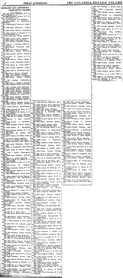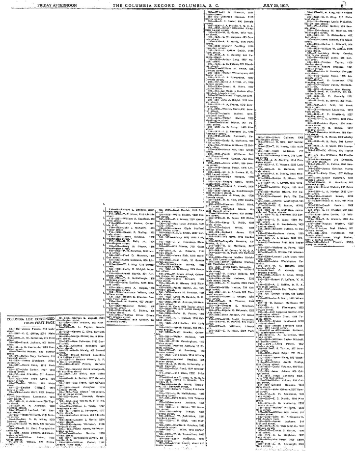 Who will constitute the first draft from Columbia and Richland county for the new army of democracy drawn at Washington today? Those whose names appear in black-faced type in the following two columns will be examined for the initial quota, consecutively from No. 1 through the list until 190 have been chosen for Columbia and 205 for Richland county. For Columbia 330 names are shown in the order in which drawn, and for Richland county 410. These are double the number desired, but it is estimated it will take that number because of probable exemption snd discharges. Should the two lists be exhausted before the required quotas are completed, further call will be made on those registrants whose names appear from 381 for Columbia and 411 for Richland county.