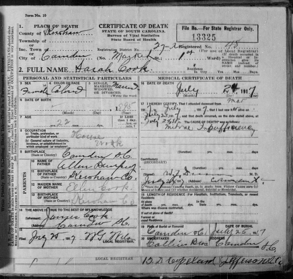 She died on 24 Jul 1917 in Camden, Kershaw, South Carolina, USA at Market street. Sarah Dempsey was buried on 25 Jul 1917 in Camden, Kershaw, South Carolina, USA at Quaker Cemetery. Her cause of death was mitral insufficiency.