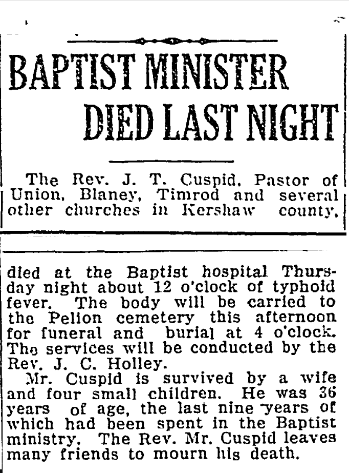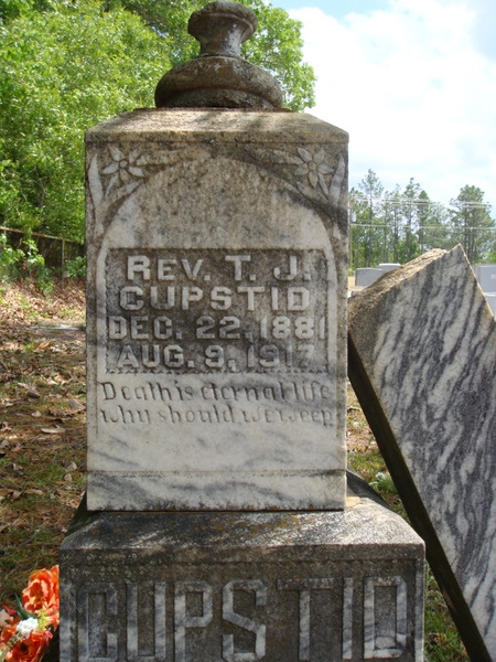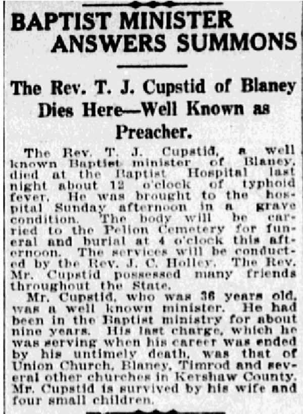 The Rev. J. T. Cupstid, a well known baptist minister of Blaney, died at the Baptist hospital Thursday night, August 9, 1917 about 12 o’clock of typhoid fever. He was brought to the hospital Sunday afternoon in a grave condition.