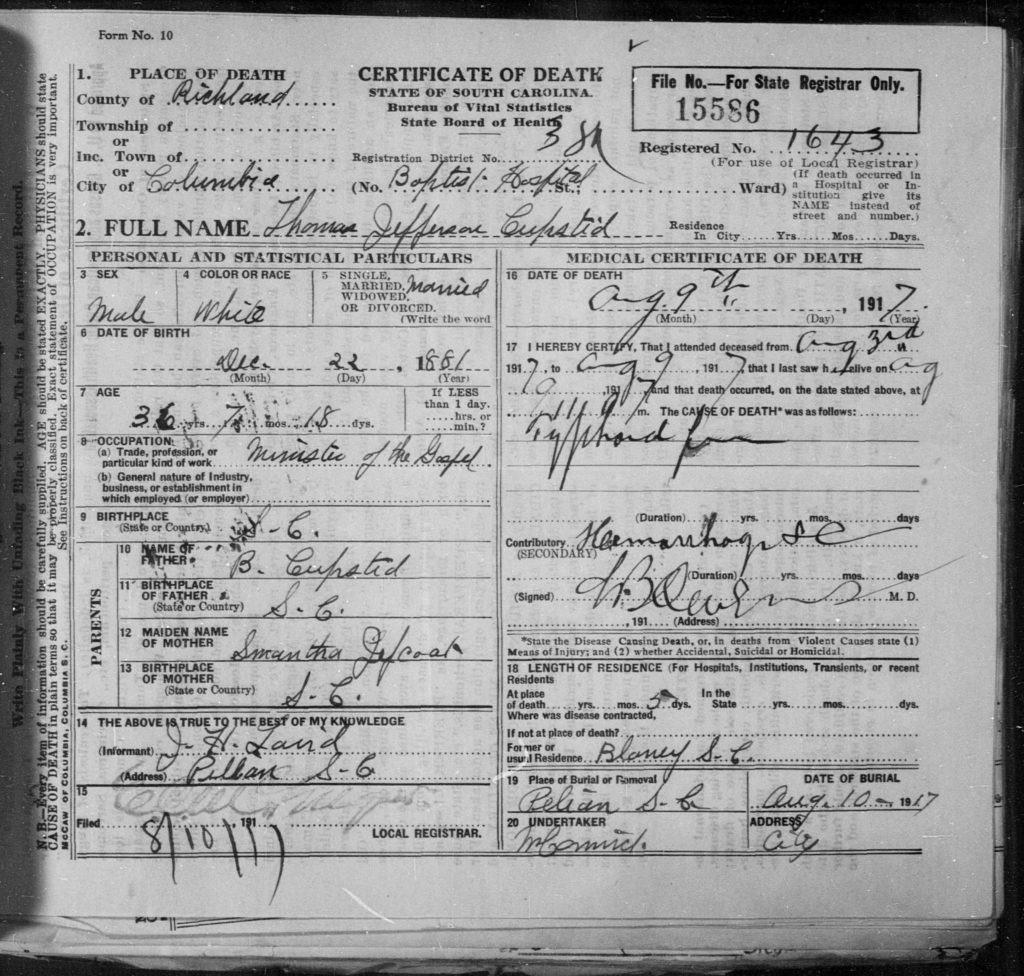 Reverend Thomas Jefferson Cupstid was born December 22, 1881