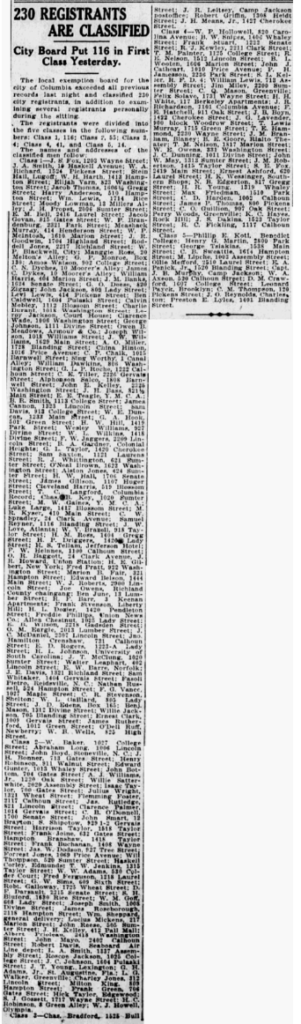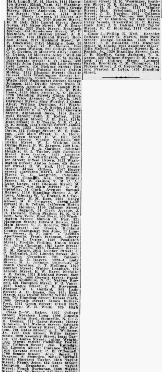 J. S. Fox, 1203 Wayne street; J. A. Smith, 10 Haskell avenue; W. A. Richard, 1524 Pickens street; Stein Hail, Lugoff; W. H. Harth, 1413 Hampton Street; Elijah Varn, 823 Washington street; Jacob Thomas, 1606 1/2 Gregg Street: Harry Anderson, 510 Hampton Street; Wm. Lewis, 1714 Rice Street; Moody Lowman, 13 Millers Alley; J. H. Propst, 2006 Sumter street: E. M. Bell, 2416 Laurel Street; Jacob Govan, 815 Gates street; W. p. Brandenburg, 2321 Park street; Menshack Murray, 414 Henderson street; W. P. McIntosh, 1610 Marion street; J. R. Goodwin, 1704 Highland street; Roddell Jones, 2217 Richland street; W. P. Blackwell, city; Manggie Ross, 20 Melton’s alley; G. P. Monroe, Box 130; Amos Watson, 902 College street; C. N. Dyches, 10 Moorer’s alley; William Harris, 404 Marion street; J. M. Banks, 1625 Senate street; G. O. Deese, 820 Zigzag; John Jackson, 809 Lady street; Levi Lewis, 414 Pickens street; Ben Caldwell, 1604 Pulaski street; Calvin Mobley, 1112 Blossom street; Charlie Durant, 1018 Washington street; Leroy Jackson, Court House; Clarence Wade, 1006 Washington street; George Johnson, 1111 Divine street; Owen B. Meadows, Armour & Co.; Joseph WIlson, 1018 Williams street; J. W. Williams, 1629 Main Street; A. O. Miller, 1728 Blanding street; China Hinton, 1016 Price avenue; C. P. Chalk, 1015 Barnwell street; Sing Worthy, 1 Canal alley; William Dawkins, 806 Washington street; C. E. Tiller, 226 Gervais street: Alphonson Salco, 1808 Barnwell street; John E. Kelley, 2225 Washington street; J. H. Bass, 821 1/2 Main street; E. E. Teagle, Y. M. C. A.; B. R. Smith, 1113 College street; James Cannon, 1323 Lincoln street; W. E. Duncan, 1233 Main street; G. A. Hook, 501 Green street; H. W. Hill, 1419 Park street; Wesley Williams, 927 Divine street; W. L. Wilkins, 1418 Divine Street; F. W. Jaggers, 2209 Lincoln street; B. A. Gardner, Colonial Heights; G. L. Taylor, 1420 Cherokee street; Sam Saxton, 1121 Laurens street; R. J. Whittington, 621 Sumter street; Alston Jones, 424 Sumter Street; H. W. Hall, 1706 Senate street; James Gillson, 1107 Huger street; Cleveland Harris, 519 Blossom street; T. C. Langford, Columbia Record; Chas. B. Key, 1020 Sumter street; M. W Gaines. Y. M. C. A.; Luke Large, 1417 Blossom street; M. R. Kyser, 410 Main street; C. W. Spradley, 24 Clark avenue; Samuel Reyner, 1116 Blanding street; J. W. Love, Atlanta; W. V. Brazell, 918 Taylor Street; H. M. Ross, 1404 Gregg street; H. P. Driggers, 1420 Lady Street; H. S. Tellam, Jefferson hotel; F. M. Hennies, 1100 Calhoun street; O. R. Baggott, 24 Clark avenue, J. R. Howard, Union Station; H. E. Gilbert, New York; Fred Pratt, 922 Washington street; Marion B. Fair, 321 Hampton street; Edward Belson, 1444 Main Street; W. J. Roberts, 2900 Lincoln street; Joe Owens, Richland county chain gang; Ben June; 13 Lumber street; R. F. Barr, 3 Keenan apartments; Frank Stevenson, Liberty Hill; H. L. Dozier, 1420 Pendleton street; Freddie Phillips, Union News Co.; Allen Chestnut, 1025 Lady street; E. B. Wilson, 2218 Gadsden street; O. M. Eargle, 2013 Lumber Street; J. C. McDaniel, 2307 Lincoln street; Jno. Hamilton Crenshaw, 731 Calhoun street; E. D. Rogers, 1223-A Lady street; II. L Johnson, University of South Carolina; J. T. McClung, 1020 Sumter street; Walter Leaphart, 402 Lincoln street; E. W. Barre, Norfolk; J. E. Davis, 1321 Richland street; Sam Whitaker, 1404 Gervais street; Fasoli Pietro, Reidsville, N. C.; Nathan Russell, 524 Hampton street; F. G. Vance, 1027 Maple street; C. R. Stevenson, Shelton; W. L. Gaillard, 805 Lady Street; J. D. Edens, Box 165; Benj. Mason, 1312 Divine street; Wilie Jackson, 705 Blanding street; James Rutherford, 1012 Green street; O’Dell Ruff, Newberry; W. B. Wells, 825 High street.