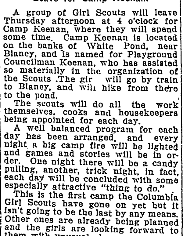 A group of Girl Scouts will leave Thursday afternoon at 4 o’clock for Camp Keenan, where they will spend some time. Camp Keenan is located on the bank of White Pond, near Blaney and is named for Playground Councilman Keenan, who as assisted so materially in the organization of the Scouts. The girls will go by train to Blaney, and will hike from there to … Continue reading Leave for Camp Keenan