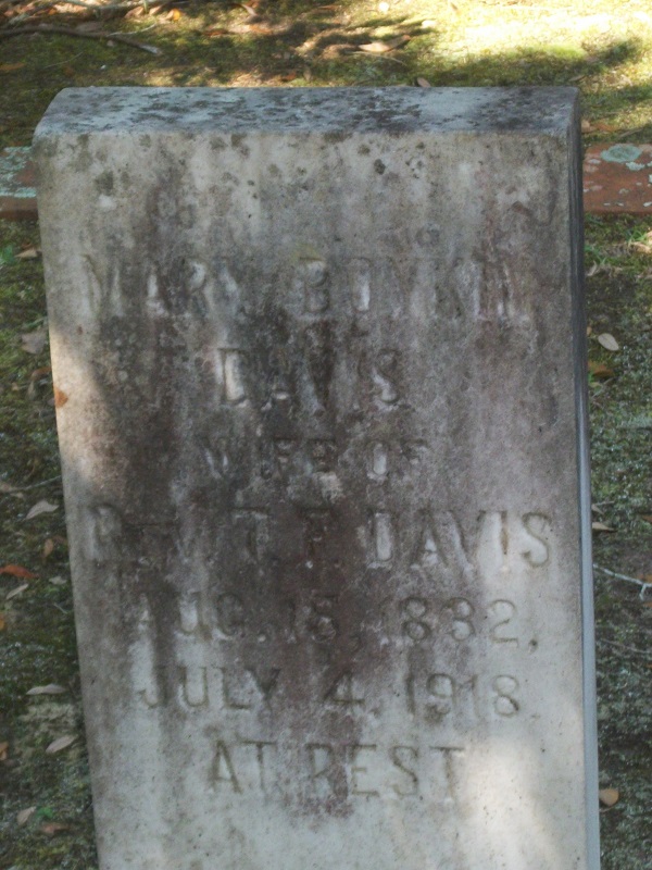 Mrs. Mary B. Davis was counted in the census on 02 May 1910 in Atlanta, Fulton, Georgia, USA, as a 77-year-old, female, widowed, white, Mother-in-law. Also in the home were; her son-in-law, Frank Lippett; her daughter, Mary Lippitt; her grandchildren; Thomas D Lippett, Lowndes M Lippett, and Elizabeth F Lippett; and lodgers, Fairfax Lopsley and Harry L Farr.