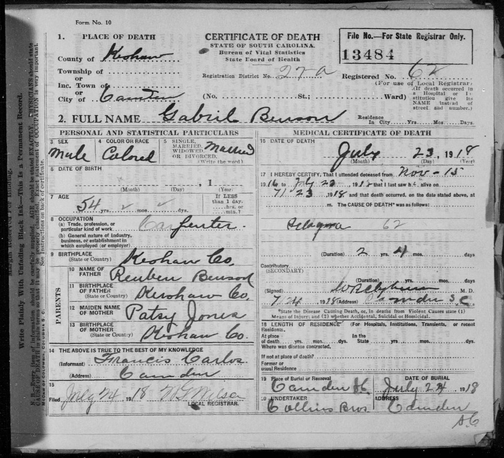 He died on 23 Jul 1918 in Camden, Kershaw, South Carolina, USA. Gabriel Benson was buried on 24 Jul 1918 in Camden, Kershaw, South Carolina, USA at Cedars Cemetery. His cause of death was Pellagra.