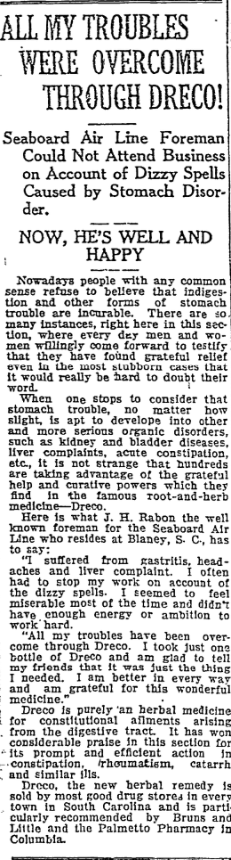 Dreco, the new herbal remedy is sold by most good drug stores in every town in South Carolina and is particularly recommended by the Bruns and Little and The Palmetto Pharmacy in Columbia.