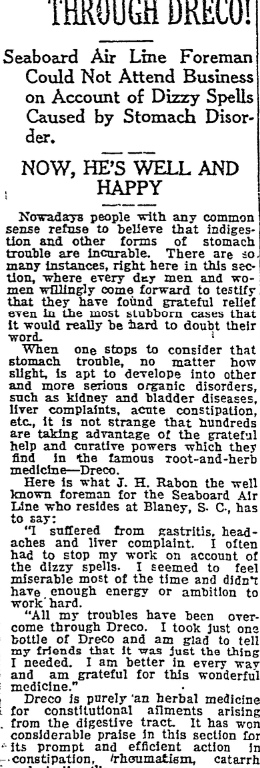 Dreco, the new herbal remedy is sold by most good drug stores in every town in South Carolina and is particularly recommended by the Bruns and Little and The Palmetto Pharmacy in Columbia.