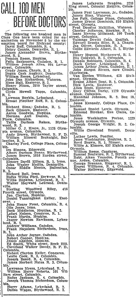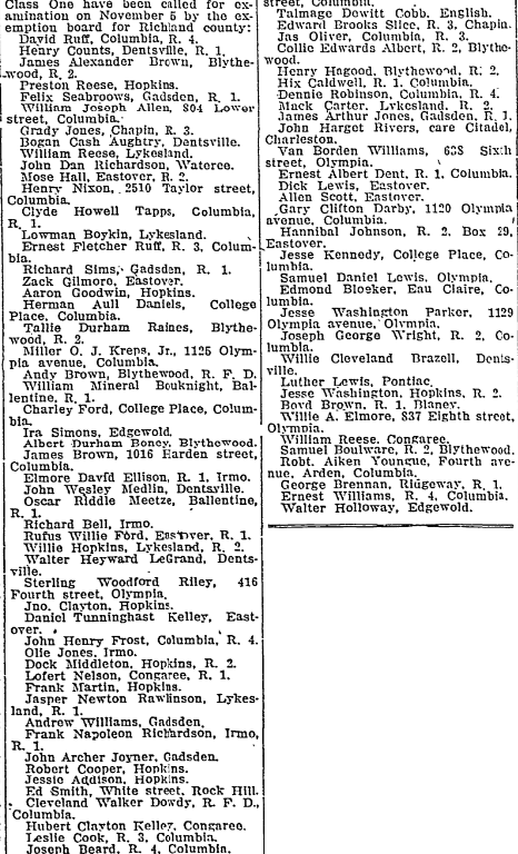 The following one hundred men in Class One have been called for examination on November 5 by the exemption board for Richland county: