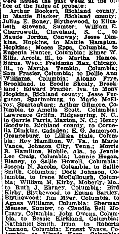 The following marriage licenses were issued the past week in the office of the judge of probate for Richland County: Riley Ashford, Columbia to Ella Chappelle, Columbia Lonnie Boyd, Columbia to Hattie May Haynes, Columbia George Belton, Congaree, SC to Rachael Wilson, Richland County, SC Elbert E. Baer, Kansas City, MO to Sydney Gresham, Greenville, SC Andrew Bookman, SC to Lizzie Ashley, Bookman, SC Howard … Continue reading Marriage License