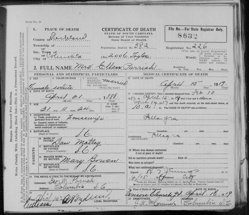 She died on 15 Apr 1919 in Columbia, Richland, South Carolina, USA. Helen Motley was buried on 16 Apr 1919 in Elgin, Kershaw, South Carolina, USA at Union Baptist Church Cemetery. Her cause of death was pellagra.