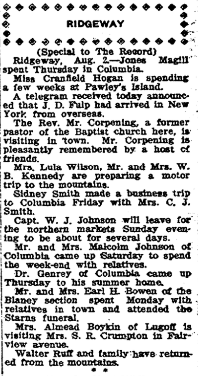 Ridgeway, Aug. 2 – Jones Magill spent Thursday in Columbia.