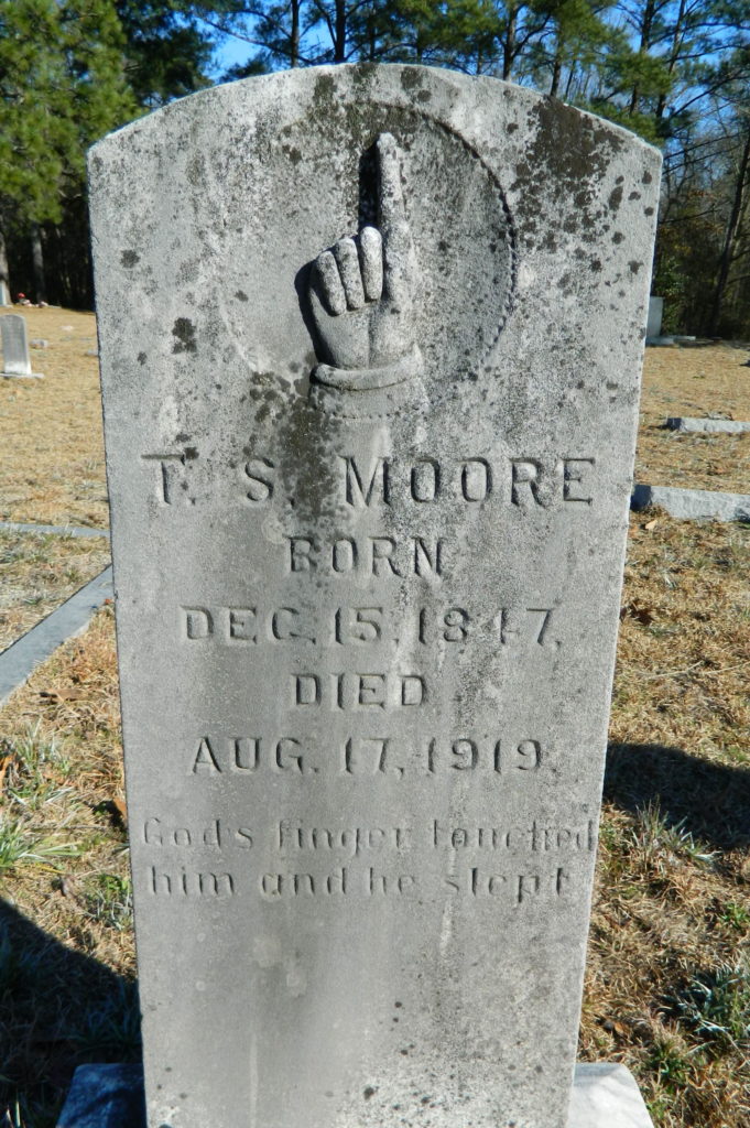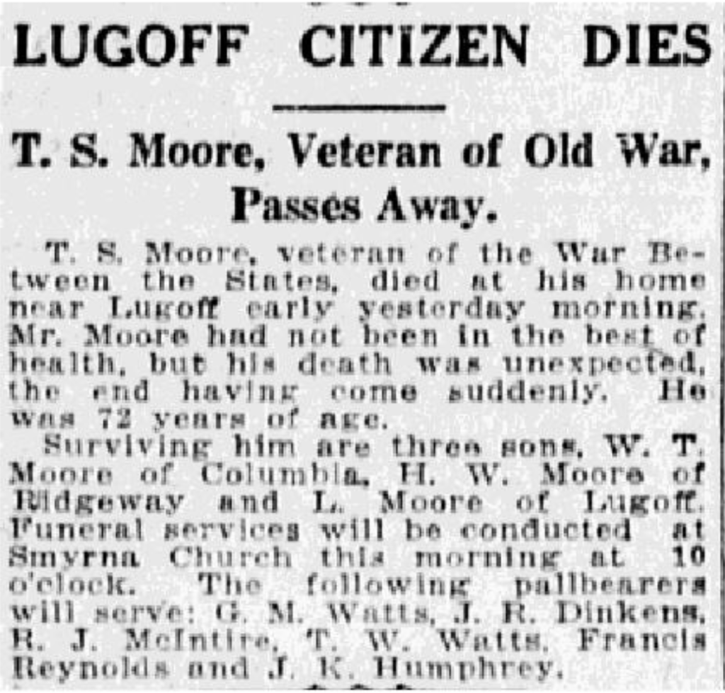T. S. Moore, veteran of the War Between the States, died at his home near Lugoff early yesterday morning, August 17, 1919. Mr. Moore had not been in the best of health, but his death was unexpected, the end having come suddenly. He was 72 years of age.