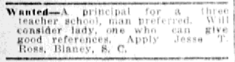 Wanted – A principal for a three teacher school, man preferred. Will consider a lady, one who can give good references. Apply Jesse T. Ross, Blaney, S. C. Continue reading Teachers