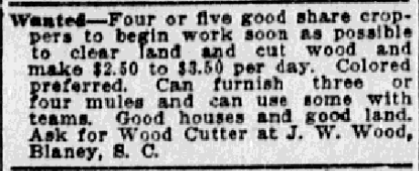 Wanted – Four or five good sharecroppers to begin work soon as possible to clear land and cut wood and make $2.50 to $3.50 per day. Colored preferred. Can furnish three or four mules and can use some with teams. Good houses and good land. Ask for Wood Cutter at J. W. Wood, Blaney, S. C. Continue reading Wanted – Male Help