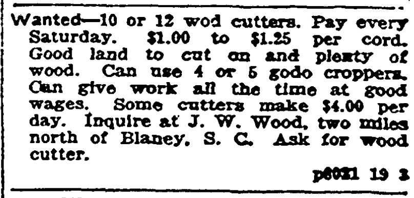 Wanted – 10 or 12 wood cutters. Pay every Saturday. $1.00 to $1.25 per cord. Good land to cut on and plenty of wood. Can use 4 or 5 good croppers. Can give work all the time at good wages. Some cutters make $4.00 per day. Inquire at J. W. Wood, two miles north of Blaney. S. C. Ask for wood cutter. Continue reading Wanted – Male Help