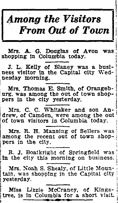 Mrs. C. C. Whitaker and son Andrew, of Camden, were among the out of town visitors in Columbia today.