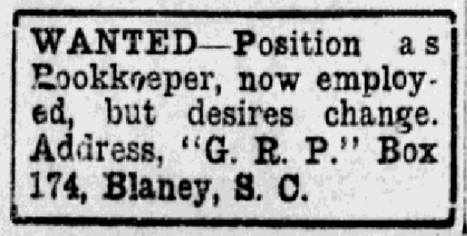 WANTED – Position as Bookkeeper, now employed, but desires change. Address, “G. R. P.” Box 174, Blaney, S. C.