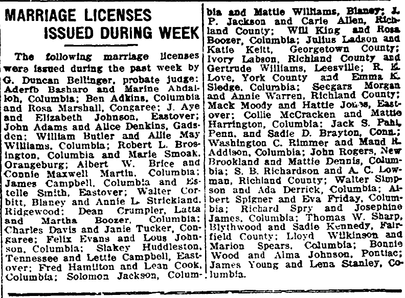 The following marriage licenses were issued during the past week by G. Duncan Bellinger, probate judge;