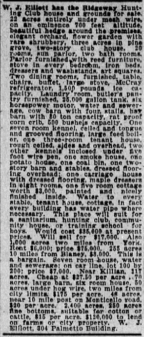 W. J. Eillott has the Ridgeway Hunting Club house and ground for sale, 22 acres entirely under mesh wire, on a eminence 700 fee altitude, beautiful hedge around the premises, elegant orchard, flower garden with rare shrubbery, three acres in pine grove, two-story club house, 20 rooms, sun parlor, two bath rooms, Parlor furnished with reed furniture, stove in every bedroom, Iron beds, dresser and washstands, art squares. Two dining rooms, furnished, table, chairs, buffet, large stove, McCray refrigerator, 1,500 pounds ice capacity. Laundry room, butler’s pantry furnished, 25,000 gallon tank, six horsepower motor, water and sewerage, cow barn with four, stalls, hay barn with 80 ton capacity, rat proof corn crib, 500 bushels capacity. One seven room kennel. ceiled and tongue and grooved flooring, large feed boiler, one three-room tenant house, rough ceiled, aides and overhead, two other kennels inclosed under five foot wire pen, one smoke house, one potato house, one coal bin, one two story barn and stables, dressed flooring maple dressers in eight rooms, one five room cottage worth $3,000, painted and nicely finished inside. Water to every stable, tenant house, cottage, in fact every building has water piped where necessary. This place will suit for a sanitarium, hunting club, community house, or training school for boys. Would cost $35,000 at present prices. Will sell for $17,000. Also 1,000 acres two miles from York, Rent $6,000; price $75,000. 255 acres 10 miles from Blaney, $3,000. This is a bargain. Seven room house, water and sewerage; on car line, lot 100 by 200; price $7,000. Near Killian, 117 acres. Cheap at $27.50 per acre, 70 acres, large barn, six room house, 50 acres, large barn, six room house, 50 acres under hog wire, two miles from city limits, $175 per acre, 46 acres, near 10 miles post on Monticello road, $20 per acre, 2,400 acres, 250 acres fine bottoms, suitable for cotton or cattle, $15 per acre. $120,000 to lend on farms or city property, W. J. Elliott, 304 Palmetto Building.