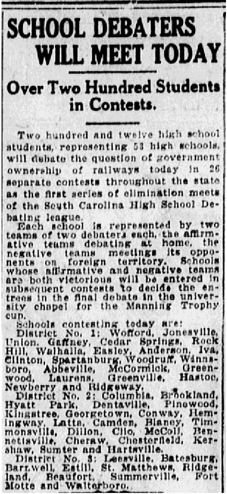 Two hundred and twelve high school students, representing 53 high schools, will debate the question of government ownership of railways today in 26 separate contests throughout the state as the first series of elimination meets of the SOuth Carolina High School Debating league.