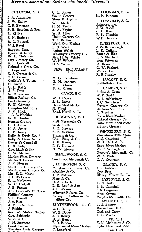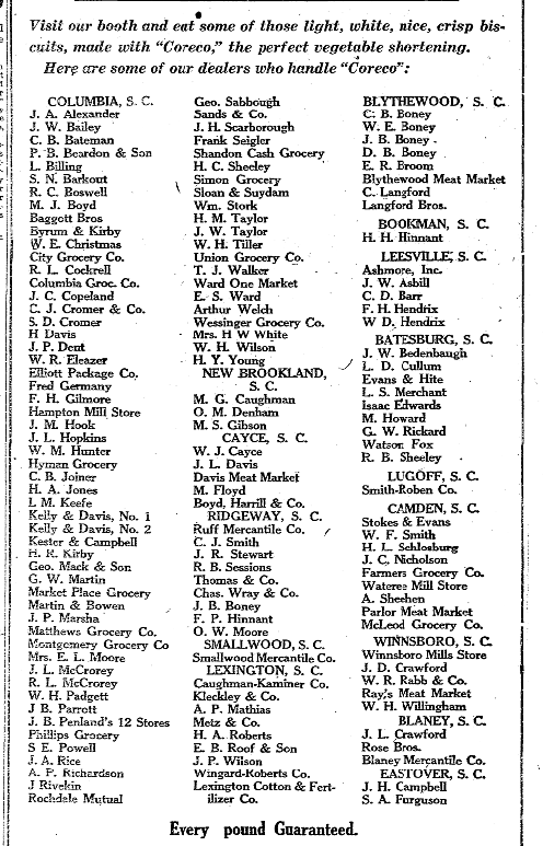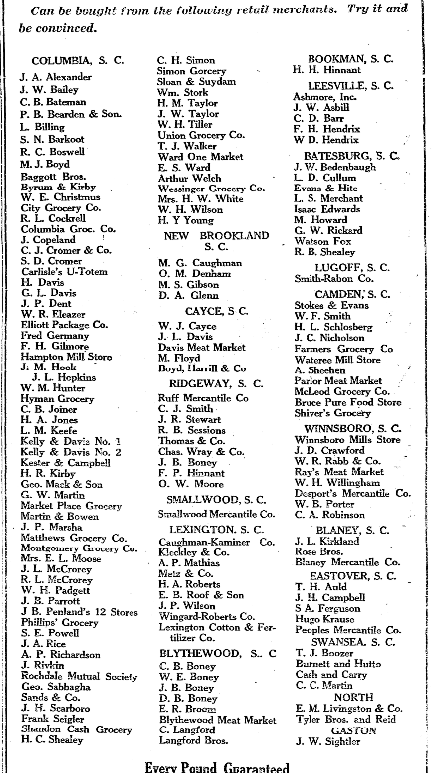 The Highest grade self-rising flour milled with be on demonstration during state fair. Visit the Sweet Rose booth. Can be bought from the following retail merchants. Try it and be convinced. COLUMBIA, S. C. Geo. Sabbough BLYTHEWOOD, S.C. J. A. Alexander Sands & Co. C. B. Boney J. W. Bailey J. H. Scarborough W. E. Boney C. B. Bateman Frank Seigler J. B. Boney P. … Continue reading Sweet Rose Self Rising Flour