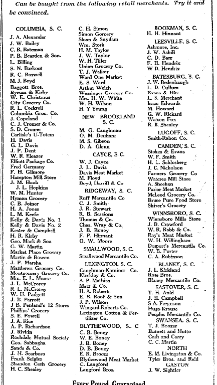 | C. B. Joiner | Davis Meat Market | LUGOFF, S. C. |