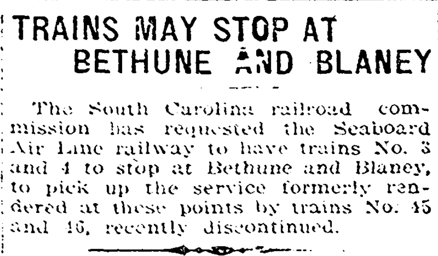 The South Carolina railroad commission has requested the Seaboard Air Line railway to have trains No. 3 and 4 to stop at Bethune and Blaney, to pick up the service formerly rendered at these points by trains No. 45 and 46, recently discontinued.