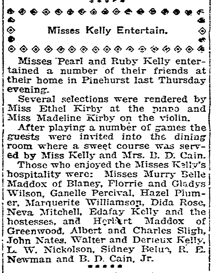 Misses Pearl Kelly and Ruby Kelly entertained a number of their friends at their home in Pinehurst last Thursday evening.