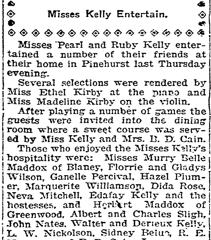 Misses Pearl Kelly and Ruby Kelly entertained a number of their friends at their home in Pinehurst last Thursday evening.