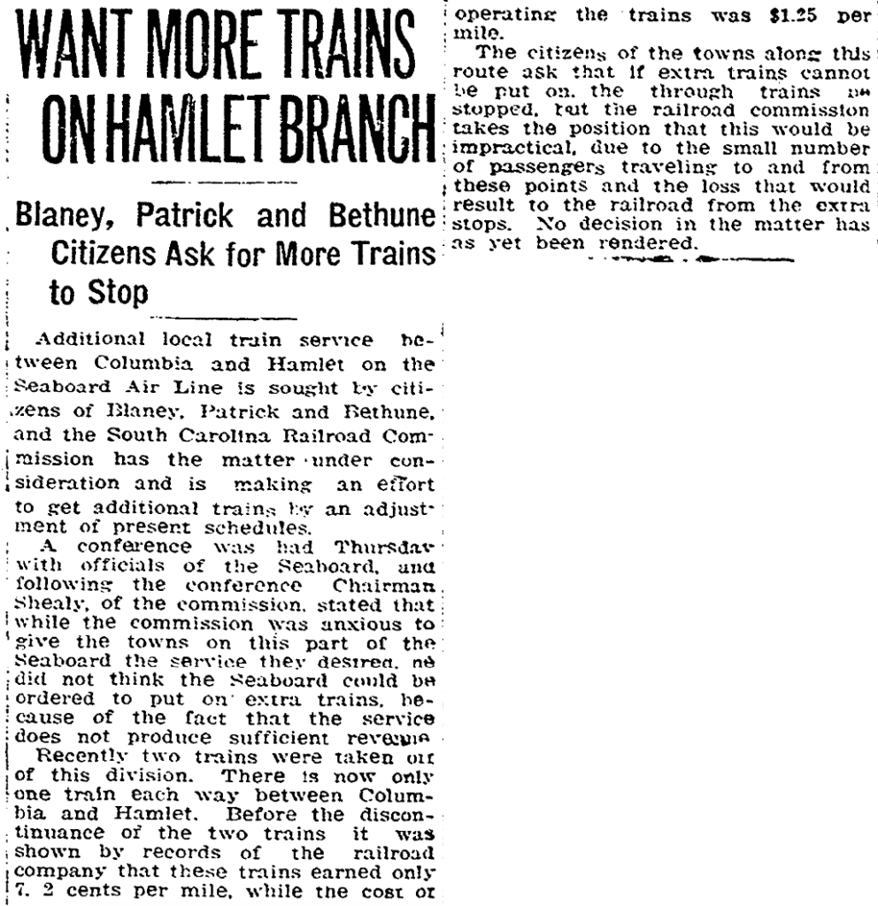 Additional local train service between Columbia and Hamlet on the Seaboard Air Line is sought by citizens of Blaney, Patrick and Bethune, and the South Carolina Railroad Commission has the matter under consideration and is making an effort to get additional trains by an adjustment of present schedules.