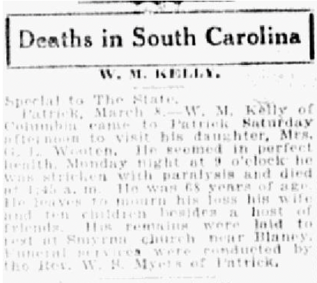 Patrick, March 8, – W. M. Kelly of Columbia came to Patrick, Saturday afternoon to visit his daughter, Mrs. G. L. Wooten. He seemed in perfect health Monday night at 9 o’clock he was stricken with paralysis and died at 1:45 a.m. He was 68 years of age. He leaves to mourn his loss his wife and ten children besides a host of friends. His remains were laid to rest at Smyrna church near Blaney. Funeral services were conducted by the Rev. W. S. Myets of Patrick.