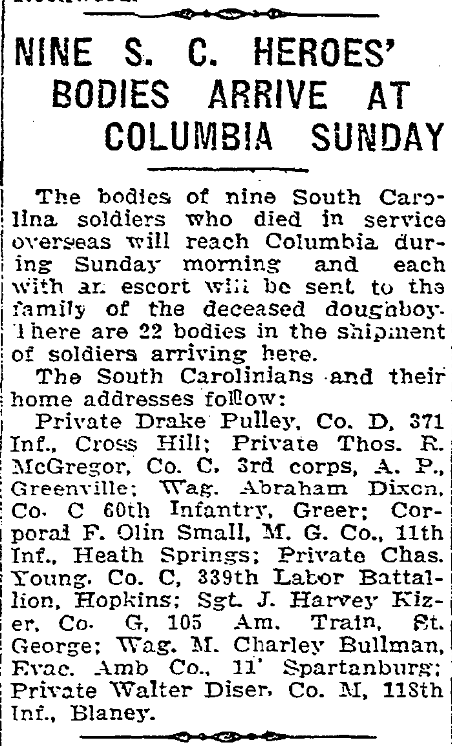 Nine S. C. Heroes’ Bodies Arrive at Columbia Sunday