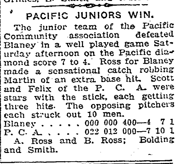The junior team of the Pacific Community association defeated Blane in a well played game Saturday afternoon on the Pacific diamond score 7 to 4. Ross for Blaney made a sensational catch robbing Martin of an extra base hit. Scott and Felix of the P. C. A. were stars with the stick, each getting three hits. The opposing pitchers each struck out 10 men.