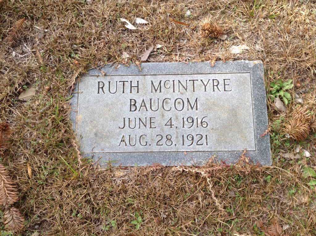 Ruth McIntyre Baucom died on 28 Aug 1921 in Wateree, Kershaw, South Carolina, USA. She was buried in Elgin, Kershaw, South Carolina, USA at Smyrna United Methodist Church Cemetery. Her cause of death was Scarlett fever.