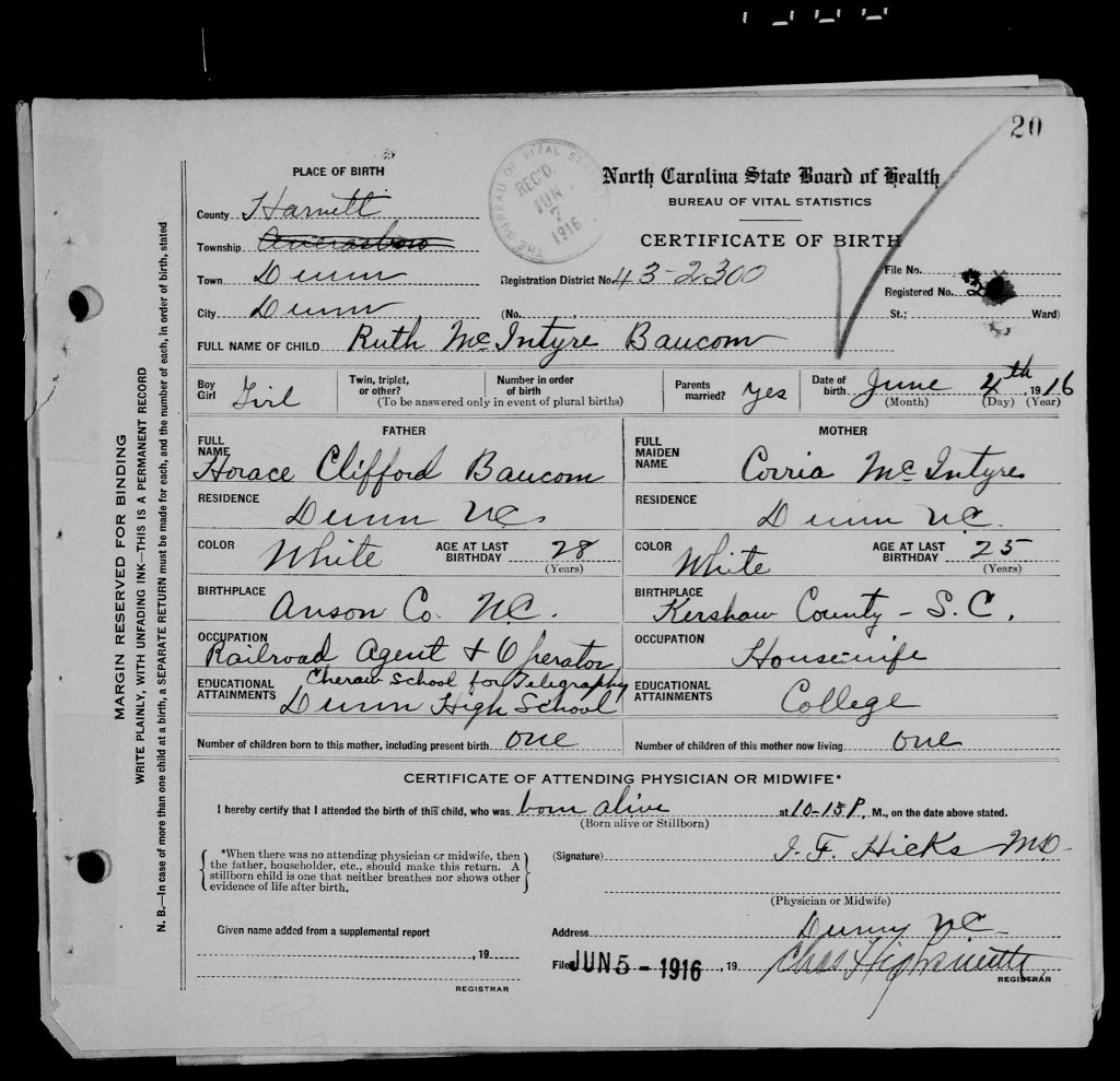 Ruth McIntyre Baucom was born on 04 Jun 1916 in Averasboro, Harnett, North Carolina, USA as the first child of Horace Clifford Baucom and Cornelia Elizabeth “Corrie” McIntyre.