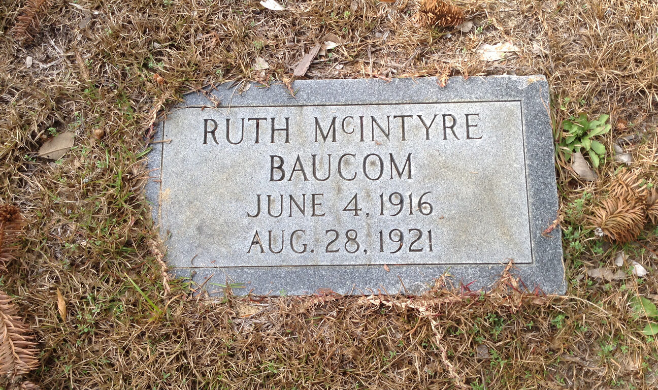Ruth McIntyre Baucom died on 28 Aug 1921 in Wateree, Kershaw, South Carolina, USA. She was buried in Elgin, Kershaw, South Carolina, USA at Smyrna United Methodist Church Cemetery. Her cause of death was Scarlett fever.