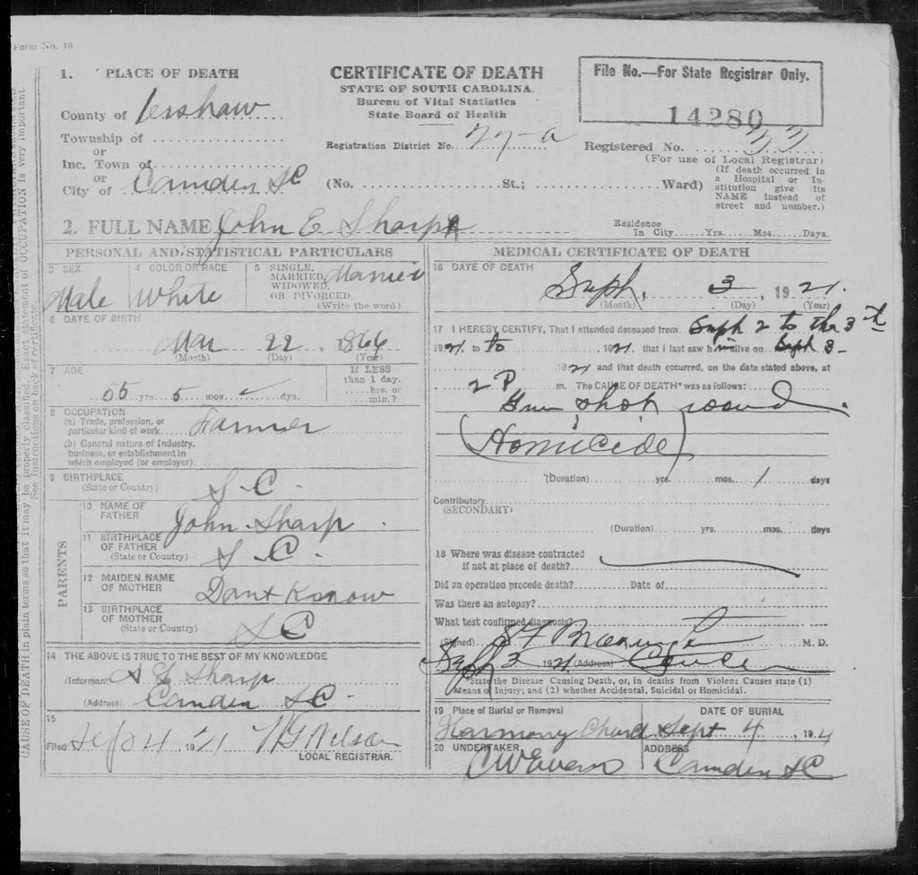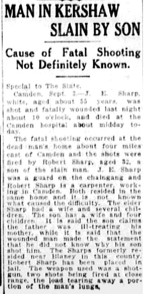 Camden, Sept. 3. – J. E. Sharp, white, aged about 55 years, was shot and fatally wounded last night about 10 o’clock, and died at the Camden hospital about midday today.