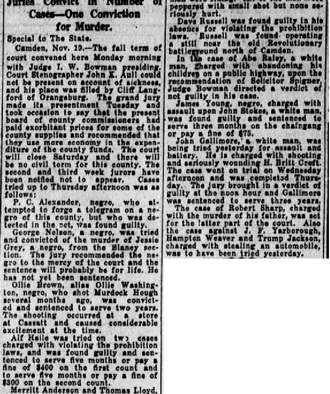 Camden, Nov. 19. – The fall term of court convened here monday morning with Judge I. W. Bowman presiding. Court stenographer John K. Aull could not be present on account of sickness, and his place was filled by Cliff Langford of Orangeburg. The grand jury made its presentment Tuesday and took occasion to say that the present board of county commissioners had paid exorbitant prices for some of the county supplies and recommended that they used more economy in the expenditure of the county funds. The court will close Saturday and there will be no civil term for this county. The second and third week jurors have been notified not to appear. Cases tried up to Thursday afternoon was as follows: