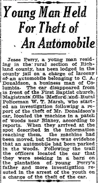 Jesse Perry, a young man residing in the rural section of Richland county, has been lodged in the county jail on a charge of larceny of an automobile belonging to a C. A. Donaldson, a business man of Columbia. The car disappeared from in front of the First Baptist church Magistrate Ollie Mefford and Rural Policeman W. T. Marsh, who started an investigation following a … Continue reading Young Man Held For Theft of An Automobile
