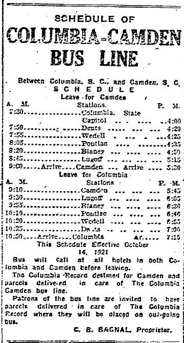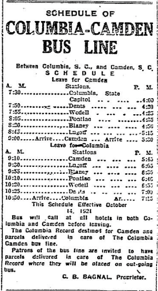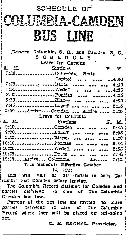 Between Columbia, S. C., and Camden, S. C.Schedule Leave for Camden A. M. Stations P. M. 7:30 Columbia, State Capitol 4:00 7:50 Dents 4:20 7:55 Wedell 4:25 8:05 Pontiac 4:35 8:20 Blaney 4:50 8:45 Lugoff 5:15 9:00 Arrive Camden Arrive 5:30 Leave for Columbia A. M. Stations P.M. 9:10 Camden 5:45 9:30 Lugoff 6:05 9:55 Blaney 6:30 10:10 Pontiac 6:45 10:20 Wedell 6:55 10:25 Dents … Continue reading Schedule of Columbia – Camden Bus Line