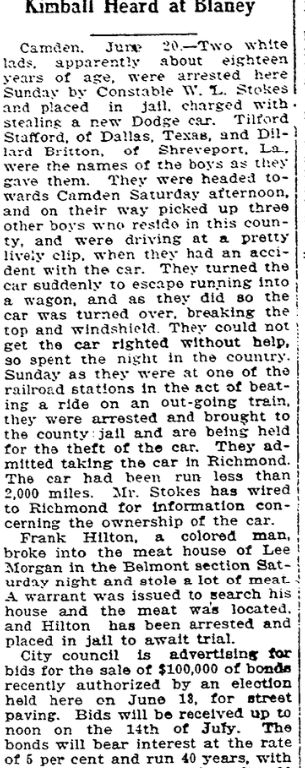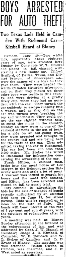 Camden, June 20. – Two white lads, apparently about eighteen years of age, were arrested here Sunday by Constable W. L. Stokes and placed in jail, charged with stealing a new Dodge car. Tilford Stafford, of Dallas, Texas, and Dillard Britton, of Shreveport, La., were the names of the boys as they gave them. They were headed towards Camden Saturday afternoon, and on their way picked up three other boys who reside in this county, and were driving at a pretty lively clip, when they had an accident with the car. They turned the car suddenly to escape running into a wagon, and as they did so the car was turned over, breaking the top and windshield. They could not get the righted without help, so spent the night in the country. Sunday as they were at one of the railroad stations in the act of beating a ride on an out-going train, there were arrested and brought to the county jail and are being held for the theft of the car. They admitted taking the car in Richmond. The car had been run less than 2,000 miles. Mr. Stokes has wired to Richmond for information oncerning the ownership of the car.
