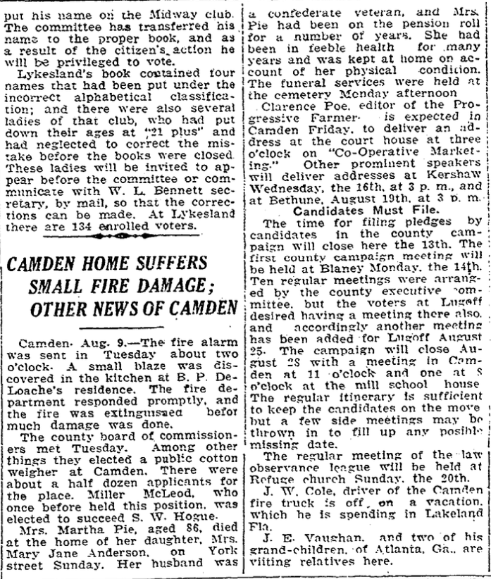 Clarence Poe, editor of the Progressive Farmer is expected in Camden Friday, to deliver an address at the courthouse at three o’clock on “Co-Operative Marketing.” Other prominent speakers will deliver addresses at Kershaw Wednesday, the 16th, at 3 p.m. and at Bethune, August 19th, at 3 p.m.
