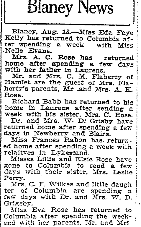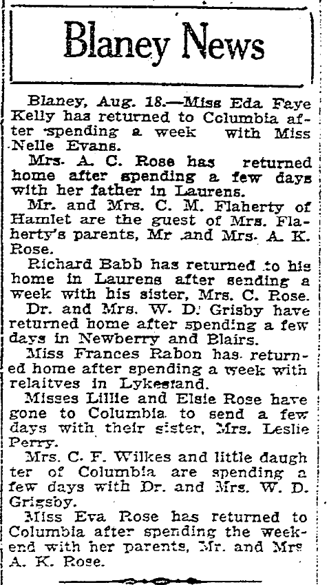 Blaney, Aug. 18. – Miss Eda Faye Kelly has returned to Columbia after spending a week with Miss Nelle Evans.