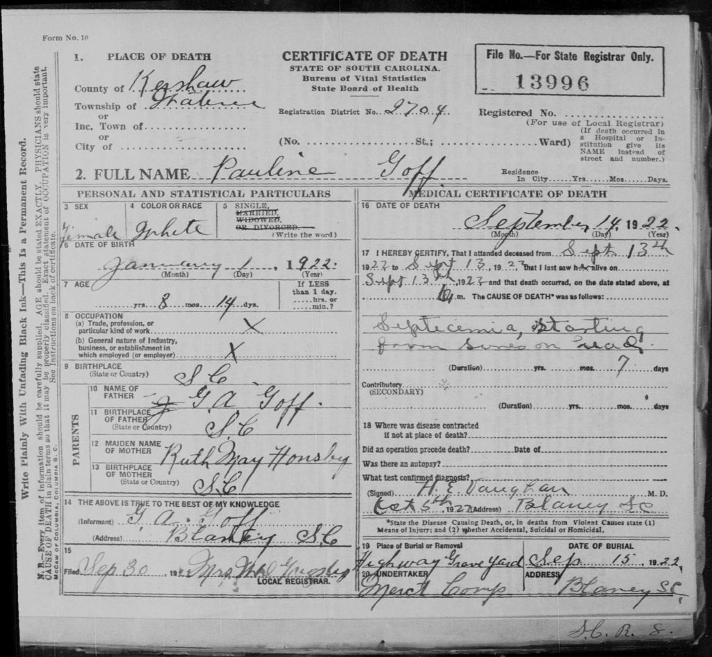 She died on 14 Sep 1922 in Wateree, Kershaw, South Carolina, USA and was buried on 15 Sep 1922 in Elgin, Kershaw, South Carolina, USA at Highway Pentecostal Holiness Church Cemetery. Her cause of death was Septicemia, starting from sores on head.
